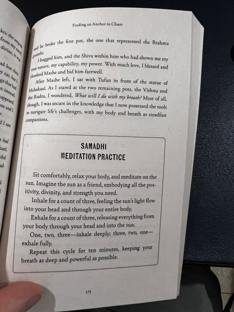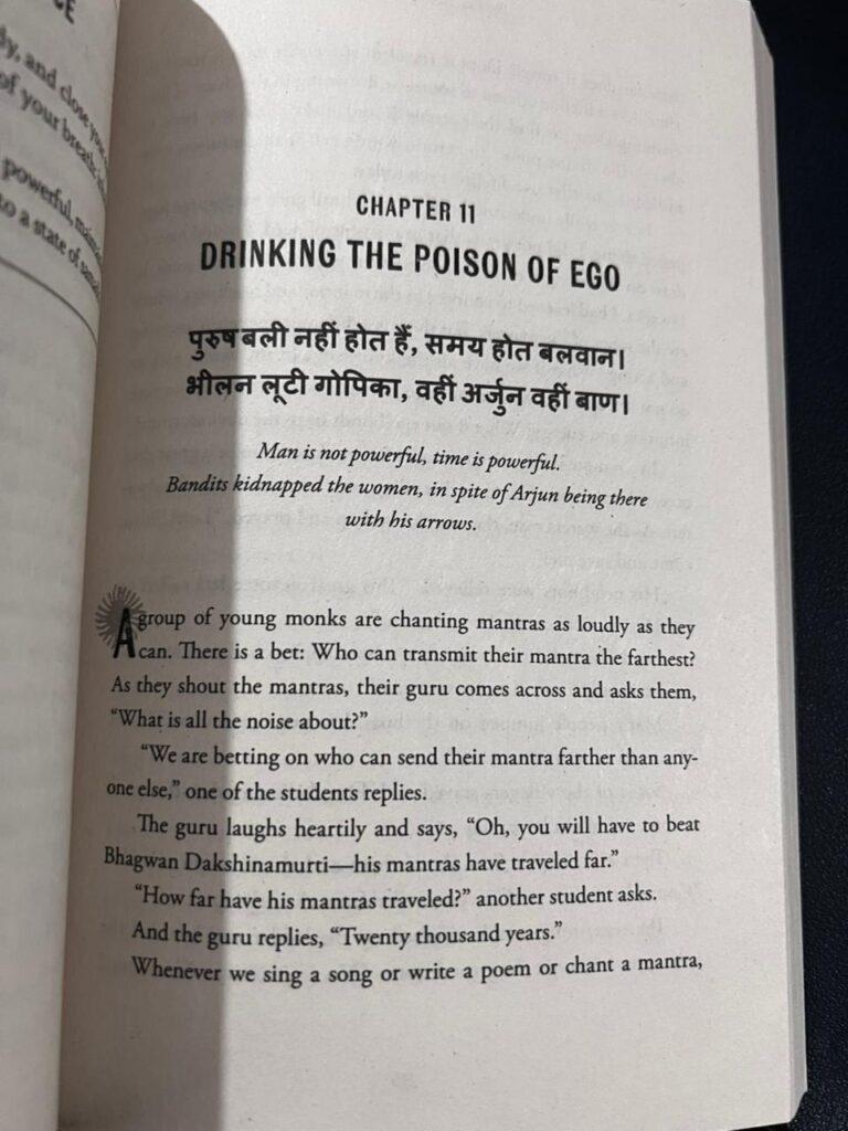 The book is structured in short, powerful chapters—each with poetic titles like “Drinking the Poison of Ego,” “The Balloon Tied to Your Toe,” and “From Destruction, a Seed Grows.” Each chapter begins with a Sanskrit shloka or an Indic quote—deeply anchoring the wisdom in Bharatiya tradition. And each chapter ends with a practice—a small meditation, a breathwork suggestion, or a contemplation. Between the quote and the meditation is a story that captures Ishan’s spiritual encounters and growth.