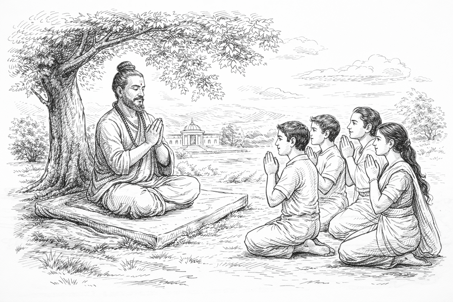You can take any subject and apply this framework. First, the teacher boils the material down to its essential truth and delivers the upadeśa. Then students listen with śraddhā, reflect and contemplate, engage in structured dialogue with peers and teacher, and finally internalize it through sādhanā, making it a living truth in their daily life.
